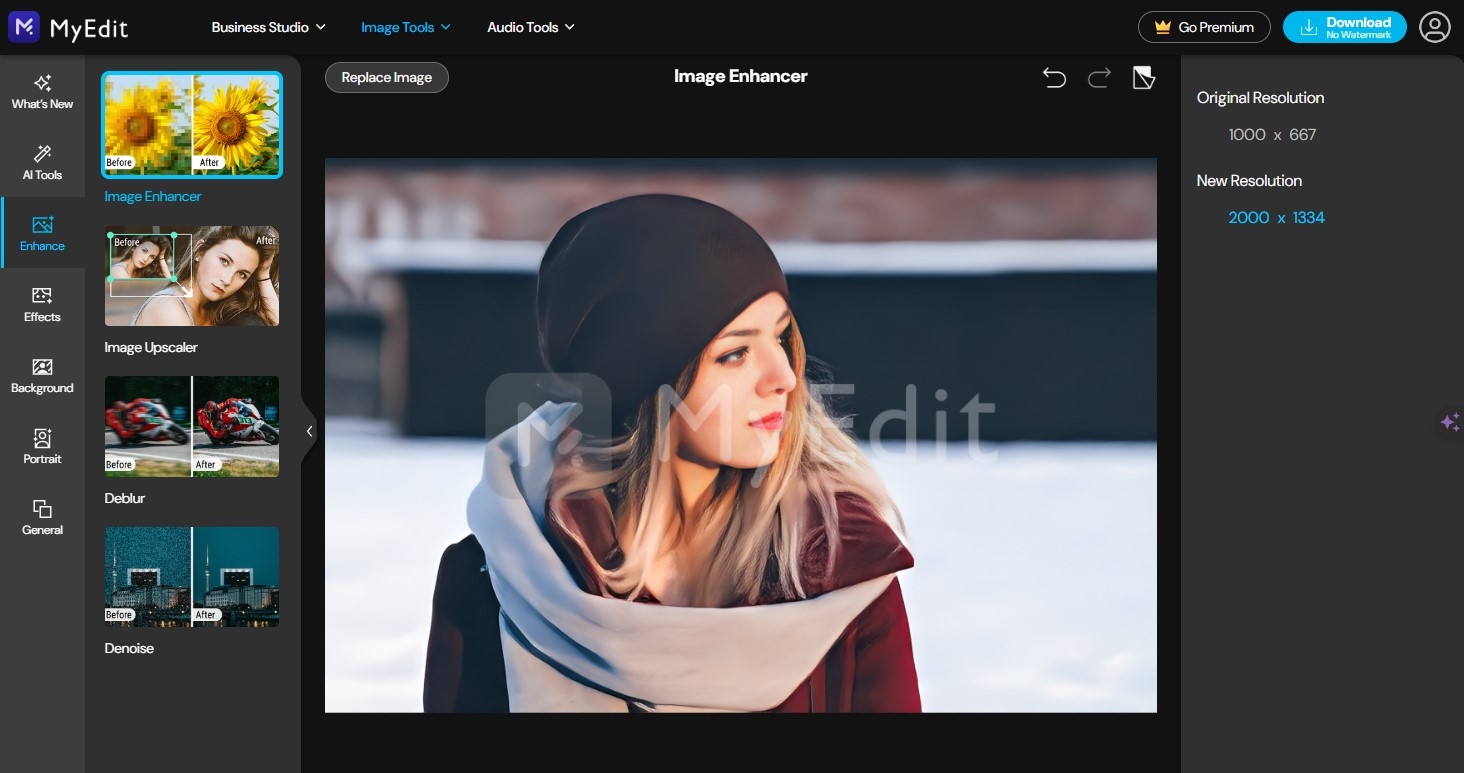 في حالة عدم رغبتك في تثبيت أي شيء على جهاز الكمبيوتر الخاص بك، يمكنك تغيير الصور باستخدام MyEdit. تتيح لك هذه الخدمة المستندة إلى الويب تعديل الصور بطرق مختلفة. تتضمن مجموعة الأدوات الخاصة به إزالة الخلفية وتبديل الوجه ورفع مستوى الصورة. يمكنك أيضًا استخدام هذه الأداة عبر الإنترنت لتغيير حجم الصور وتدويرها وقلبها وتقليل التشويش في الصور وتحويلها إلى تنسيق ملف آخر. لكن ضع في اعتبارك أنه يتعين عليك إنشاء حساب وتسجيل الدخول لتنزيل الصور التي تلمسها على هذا الموقع.